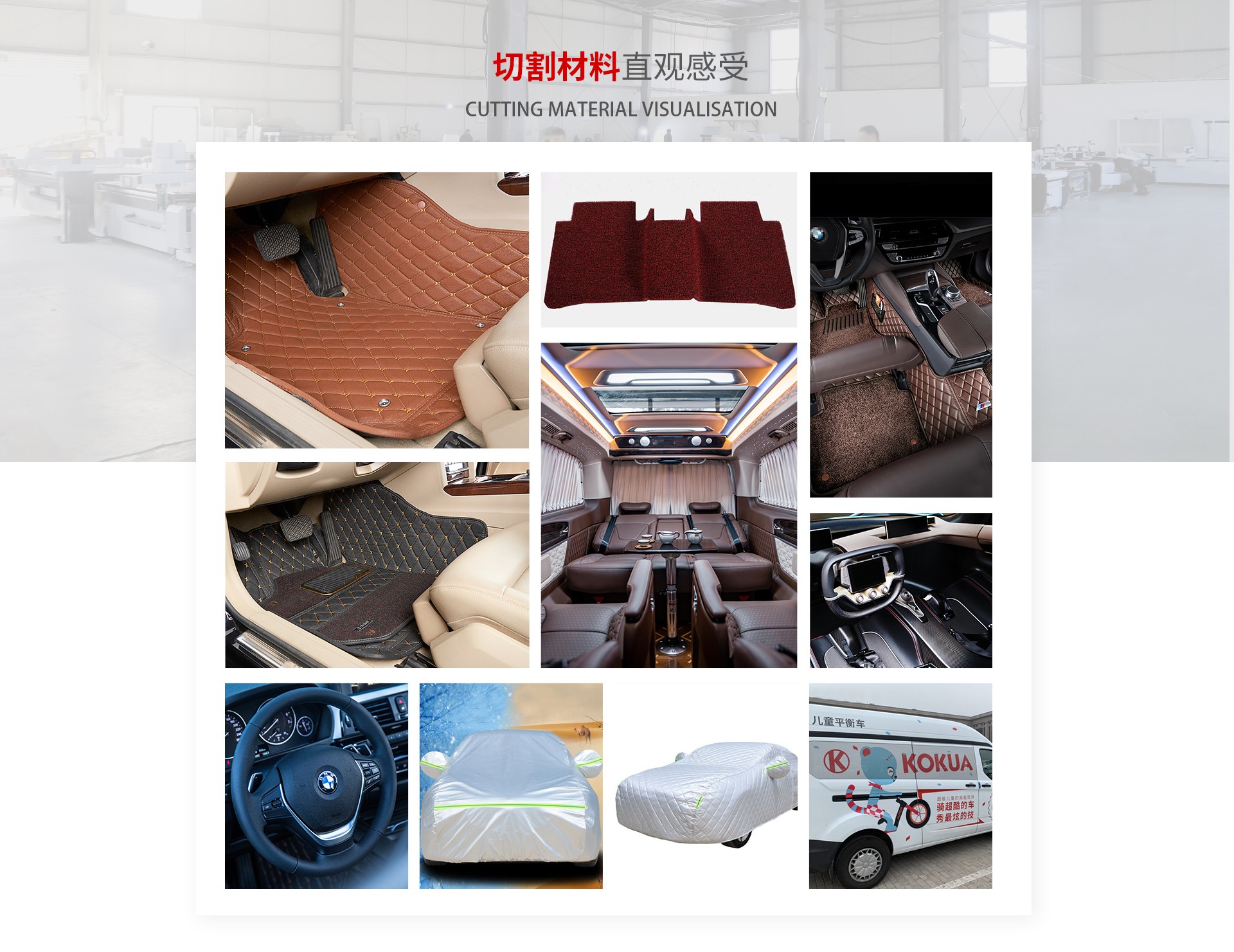 針對(duì)汽車用品行業(yè)的專車版型的特點(diǎn)卓星切割機(jī)為優(yōu)勢(shì)選擇方案。無(wú)需大量庫(kù)存,根據(jù)客戶要求,現(xiàn)場(chǎng)定制,出貨速度快。制作精美無(wú)誤差,主要切割全包圍腳墊、大包圍腳墊、絲圈腳墊、汽車坐墊、汽車座套、后備箱墊、避光墊、方向盤套等柔性材料制品。