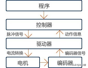 程序控制器(脈沖信號(hào))驅(qū)動(dòng)器(電流轉(zhuǎn)換)電機(jī)編碼器(編碼器信號(hào))驅(qū)動(dòng)器(動(dòng)作信息)控制器
