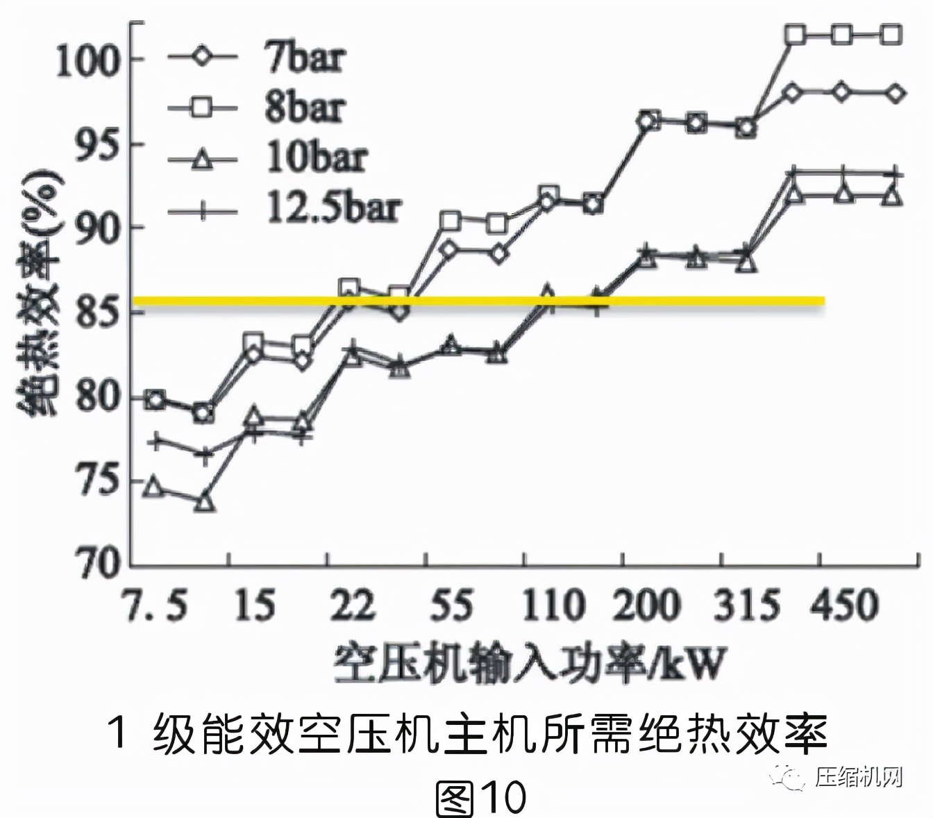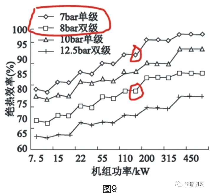從理論上來說,兩級壓縮由于級間壓縮比小,主機泄露少(壓力低),同時第二級進(jìn)氣溫度由于中間冷卻作用變低,因而在相同空壓機能效限定值,兩級比單級壓縮的所需的絕熱效率更低。見圖9為單級和雙級壓縮達(dá)到1級能效時主機所需的絕熱效率。