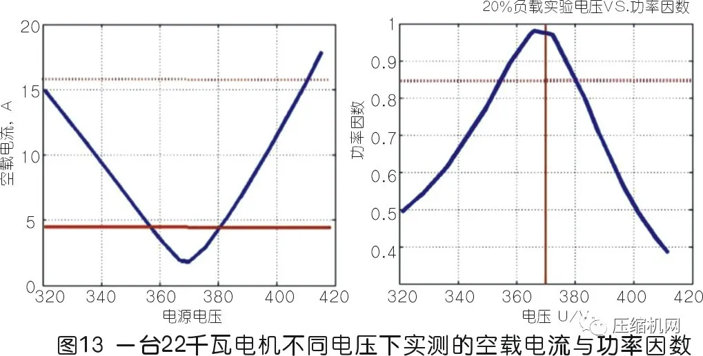 永磁電機雖然在額定電壓的時候有很好的節(jié)能效果,但是在實際用戶現(xiàn)場電壓經(jīng)常會偏離額定電壓,而當(dāng)電壓大于或者小于感應(yīng)電壓時,電流都會急劇增大,功率因數(shù)變小,節(jié)能效果大幅度變差。(見圖13)。由圖中可以看出:偏差在±3%電壓范圍內(nèi)時,電機功率因數(shù)大于或等于0.9,否則,功率因數(shù)較低。