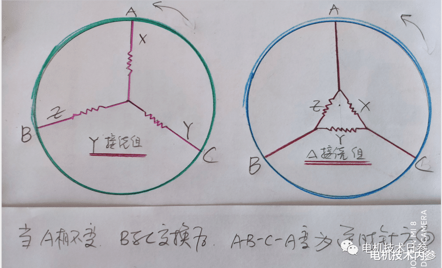 當A相的連接保持不變時,B相和C相的連接互換,自然定子磁場就是A-B-C逆時針旋轉。