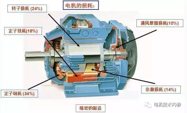 電動機在將電能轉化為機械能的同時,也會損失一些能量。典型的交流電機損耗可分為三部分:固定損耗,可變損耗和雜散損耗.可變損耗隨負載變化,包括定子電阻損耗(銅損耗)、轉子電阻損耗和電刷電阻損耗;固定損耗與負載無關,包括鐵芯損耗和機械損耗。鐵損由磁滯損耗和渦流損耗組成,磁滯損耗與電壓的平方成正比,磁滯損耗也與頻率成反比。其他雜散損耗是機械損耗和其他損耗,包括軸承的摩擦損耗和由風扇和轉子旋轉引起的風阻損耗。