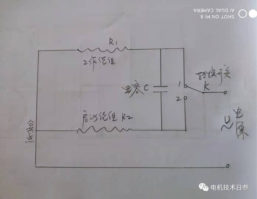 根據(jù)上述理論,下面的正反轉單相電機繞組,是在主繞組與副繞組兩個功能角色轉換條件下進行,兩個繞組的一致性,既保證了不同轉向下電機的性能符合性,同時也使電容的選擇更簡單和科學。是單相電容起動雙向旋轉電機繞組工作原理示意圖。當開關連接到點1時,R1是工作繞組,R2是起動繞組。當開關連接到點2時,R2是工作繞組,R1是起動繞組。