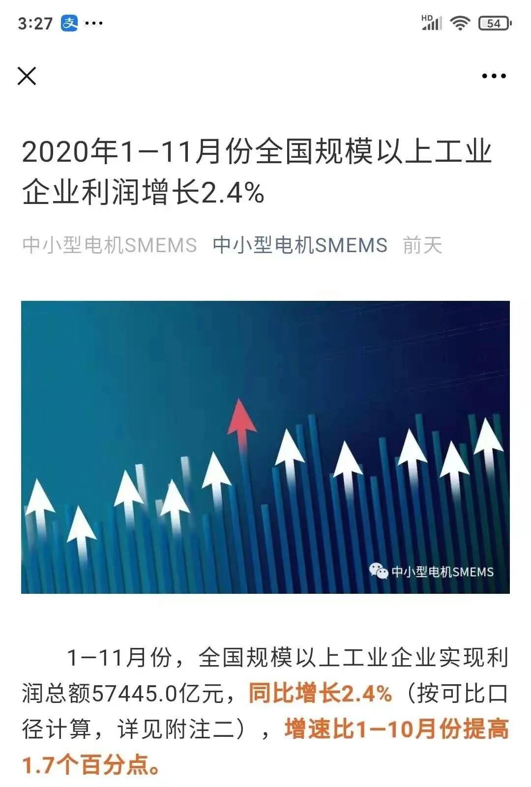 中小型電機(jī)行業(yè)協(xié)會(huì)統(tǒng)計(jì)數(shù)據(jù)顯示:2020年1—11月份,全國(guó)規(guī)模以上工業(yè)企業(yè)實(shí)現(xiàn)利潤(rùn)總額57445.0億元,同比增長(zhǎng)2.4%(按可比口徑計(jì)算),增速比1—10月份提高1.7個(gè)百分點(diǎn)。